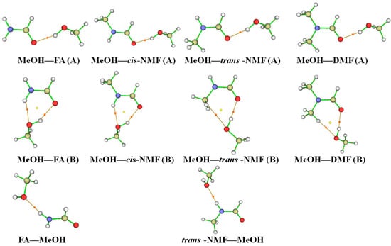 The Atoms in Molecules (AIM) plots of the MeOH–formamide and formamide–MeOH complexes obtained at the B3LYP-D3/aug-cc-pVTZ level; The bond critical points (BCPs) and ring critical points (RCPs) are presented by the ginger and yellow balls, respectively; FA: formamide; NMF: N-methylformamide; DMF: N,N-dimethylformamide; MeOH: methanol.