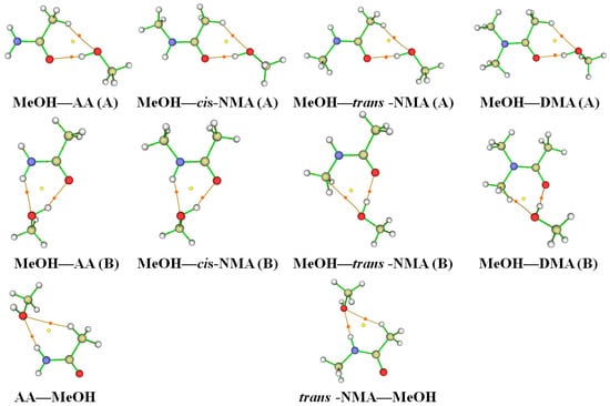 The Atoms in Molecules (AIM) plots of the MeOH–acetamide and acetamide–MeOH complexes obtained at the B3LYP-D3/aug-cc-pVTZ level. The bond critical points (BCPs) and ring critical points (RCPs) are presented by the ginger and yellow balls, respectively; AA: acetamide; NMA: N-methylacetamide; DMA: N,N-dimethylacetamide; MeOH: methanol.