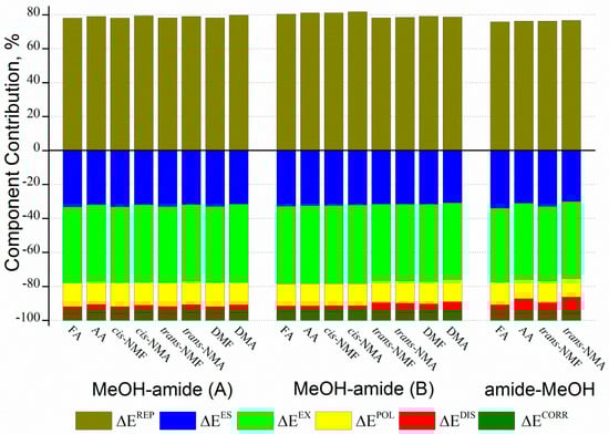 The six components’ contribution (%) to the total interaction energy in generalized Kohn-Sham energy decomposition analysis (GKS-EDA) at the B3LYP-D3/aug-cc-pVTZ level; Positive values are the repulsive component (repulsion energy (EREP)), and the negative values are the attractive components (electrostatic energy (EES), exchange energy (EEX), polarization energy (EPOL), correlation energy (ECORR) and Grimme’s dispersion energy (EDISP)); FA: formamide; NMF: N-methylformamide; DMF: N,N-dimethylformamide; AA: acetamide; NMA: N-methylacetamide; DMA: N,N-dimethylacetamide.
