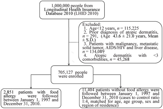 The selection process of the study population is shown in Figure 1. All diagnoses were based on the International Classification of Diseases, Ninth Revision, Clinical Modification (ICD-9-CM) codes. From this nationally representative sample of one million subjects, we identified 2851 patients with food allergies (ICD-9-CM code 693.1). A total of 11,404 control subjects (at a ratio of one case to four controls) were identified and matched for age, age group, sex, and region of residence. We identified patients aged ≥12 years who were alive on 31 December 2010 to constitute the present study cohort. Patients over 100 years of age were excluded. The outcome of interest in our study was the documentation of AD (ICD-9-CM code 691.8) by a physician in the outpatient/inpatient claims. To enhance the accuracy of outcome identification, we confirmed the diagnosis of AD by identifying at least three outpatient/inpatient attendances in the diagnosis records and excluded patients with <3 outpatient/inpatient attendances. Importantly, we excluded patients who developed AD before the diagnosis of a food allergy.