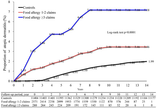 We demonstrated an overall increase in the risk of AD development in food allergy patients (Figure 2). We investigated the cumulative incidence of AD in these patients (food allergy patients with ≥3 and 1–2 claims, and healthy controls) after several years of follow-up, using the log-rank test with a Kaplan–Meier analysis (Figure 2). After 14 years of follow-up, the baseline risk of AD development in controls (>12 years of age) was 1.99%. Conversely, patients with 1–2 food allergy claims had a significantly higher AD development risk (3.46%, p < 0.0001). Moreover, patients with ≥3 claims of food allergy had an even higher AD development risk (7.18%, p < 0.0001).
