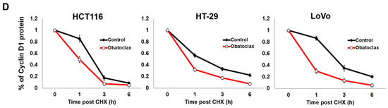 Cycloheximide chase analysis was performed as described previously [56] to define the effect of obatoclax on the stability of cyclin D1 protein. Briefly, HCT116, HT-29, and LoVo cells (5 × 105) were exposed to obatoclax (200 nM) for 18 h, followed by 6 h-treatment with cycloheximide (50 µg/mL) to stop de novo protein synthesis. Cyclin D1 levels at 0, 1, 3, and 6 h following cycloheximide co-treatment were then determined by immunoblotting.