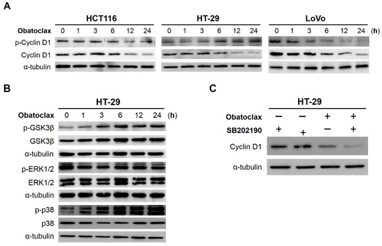 Obatoclax induces T286 phosphorylation-dependent or -independent cyclin D1 degradation. (A) Cell line-dependent effect of obatoclax on cyclin D1 T286 phosphorylation. HCT116, HT-29, and LoVo cells were subject to 24 h-treatment with obatoclax (200 nM), followed by immunoblotting to evaluate the levels of threonine 286 (T286)-phosphorylated cyclin D1 (p-Cyclin D1) at indicated time points. α-Tubulin levels served as equal loading control; (B) Obatoclax inhibits GSK3β but activates p38MAPK, while barely affecting ERK1/2 activity in HT-29 cells. HT-29 cells were exposed to 200 nM of obatoclax for 24 h. The status of activation of GSK3β, ERK1/2, and p38MAPK at indicated time points was determined by immunoblotting for corresponding phosphorylation. Specifically, serine 9-phosphorylation of GSK3β (p-GSK3β) reveals inhibition of GSK3β activity, whereas dual phosphorylation at threonine 202/tyrosine 204 of ERK1/2 (p-ERK1/2) and threonine 180/tyrosine 182 of p38MAPK (p-p38) indicate activation of ERK1/2 and p38MAPK, respectively. α-Tubulin levels served as equal loading control; (C) p38MAPK activity is not required for obatoclax-induced cyclin D1 downregulation in HT-29 cells. HT-29 cells were exposed to obatoclax without or with pre-treatment of the p38MAPK-specific inhibitor SB202190 (10 µM) for 24 h, followed by cyclin D1 immunoblotting. The data revealed that blockade of p38MAPK activity fails to restore cyclin D1 levels downregulated by obatoclax.
