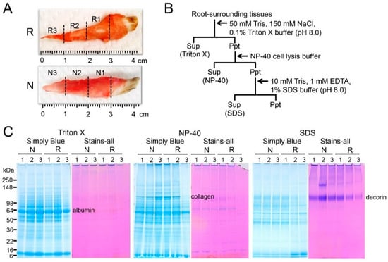 Extraction of proteins in root-surrounding tissues on deciduous incisor teeth. (A) Deciduous incisor teeth with (R) or without (N) root resorption from five-month-old pigs. The root-surrounding tissues were scraped off by dividing them into three regions (R1–R3 and N1–N3) at 1-cm intervals from the cervical area to the apical area of the tooth; (B) Flow chart indicates the procedures used to produce extracts for proteins in root-surrounding tissues. Sup: supernatant; Ppt: precipitate; (C) SDS-PAGE (5% to 20% gradient gel) stained with Simply Blue Safe Stain (Simply Blue) and Stains-all indicates each fraction.