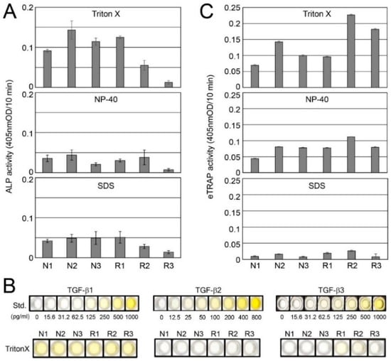 Detection of alkaline phosphatase (ALP)-inducing activities and endogenous TRAP (eTRAP) activities in root-surrounding tissues, and identification of TGF-β isoforms. (A) ALP-inducing activity of HPDL cells exposed by protein extracts in N1–N3 and R1–R3 extracted with Triton X, NP-40, and SDS buffers from root surrounding tissues (n = 6 culture wells per sample); (B) enzyme-linked immunosorbent assay (ELISA) for the detection of TGF-β1, TGF-β2, and TGF-β3 in N1–N3 and R1–R3 extracted with Triton X; (C) eTRAP activity in N1–N3 and R1–R3 extracted with Triton X, NP-40, and SDS buffers from root surrounding tissues (n = 3 tests per sample).