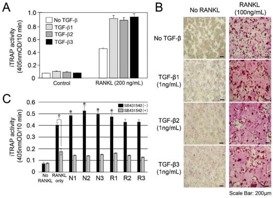In vitro experiment for RANKL (receptor activator of NF-κB ligand)-mediated osteoclast differentiation. (A) Induced TRAP (iTRAP) activity of RAW264 cells exposed by TGF-β isoforms (1 ng/mL each) with (RANKL) or without (Control) the addition of RANKL (200 ng/mL) (n = 6 culture wells per group); (B) TRAP staining for RAW264 cells exposed by TGF-β isoforms without (left panel) or with (right panel) RANKL (100 ng/mL); (C) iTRAP activity of RAW264 cells exposed by protein extracts in N1–N3 and R1–R3 of root surrounding tissues with or without the addition of GST (glutathione S-transferase)-RANKL (200 ng/mL) and SB431542 (1 µM). In the RANKL only sample, the dagger (†) indicates a significant difference between with and without SB431542. The asterisk (*) on the bar graph without SB431542 indicates a significant difference between each sample and RANKL only. In the group with SB431542, there were no significant differences between each sample and RANKL only. Statistical significance (* or †) was determined with an unpaired Student’s t-tests. In all cases, p < 0.05 was regarded as statistically significant.
