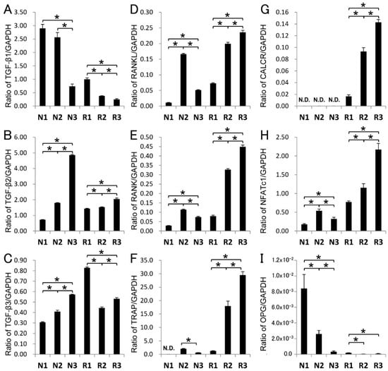 Gene expression in root surrounding tissues. mRNA expressions via qPCR analysis of (A) TGF-β1, (B) TGF-β2, (C) TGF-β3, (D) RANKL, (E) RANK, (F) TRAP, (G) CALCR, (H) NFATc1 and (I) OPG were shown. Each ratio was normalized to the relative quantification data of each mRNA in N1–N3 and R1–R3 of root-surrounding tissues compared with a reference gene (GAPDH), which was generated on the basis of a mathematical model for relative quantification in a qPCR system (n = 6 tissues). Statistical significance (*) was determined with an unpaired Student’s t-tests. In all cases, p < 0.05 was regarded as statistically significant.