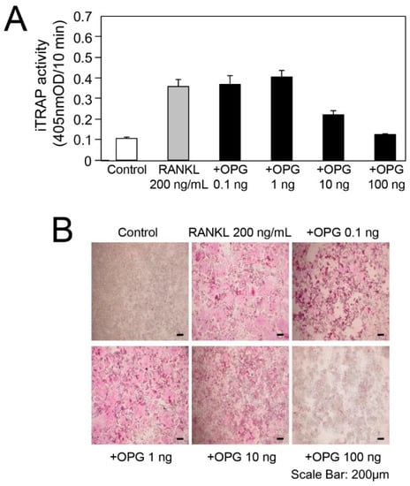 Effect of OPG against RANKL stimulated RAW264 cells. (A) iTRAP activity (n = 6 culture wells for each group) and (B) TRAP staining of RAW264 cells exposed by RANKL only (200 ng/mL) without (Control) or with the addition of various concentration of OPG (0.1 to 100 ng).