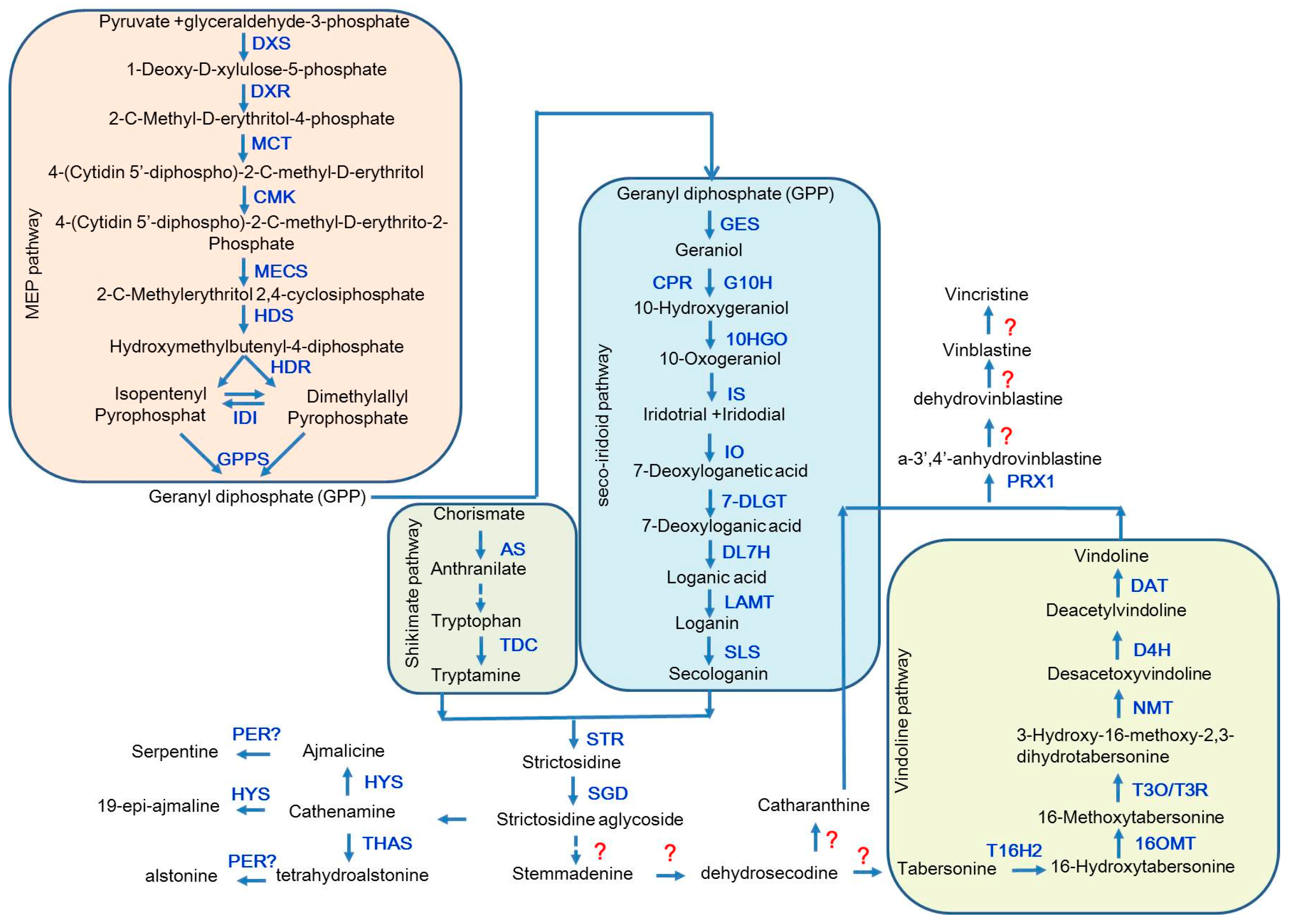 Schematic biosynthetic pathways for terpenoid indole alkaloids (TIAs) in Catharanthus roseus. The updated TIA biosynthetic pathways are presented by incorporating the most recently published results. Question marks in red indicate unknown process or enzymes for the reactions. Abbreviations are: DXS, 1-deoxy-d-xylulose 5-phosphate synthase; DXR, 1-deoxy-d-xylulose 5-phosphate reductoisomerase; MCT, MEP cytidyltransferase; CMK, 4-(cytidine 5′-diphospho)-2-C-methyl-d-erythritol kinase; MECS, 2-C-methylerythritol 2,4-cyclodiphosphate synthase; HDS, hydroxymethylbutenyl 4-diphosphate synthase; HDR, hydroxymethylbutenyl 4-diphosphate reductase; IDI, isopentenyl diphosphate isomerases; IPP isomerase; GPPS, geranyl diphosphate synthase; GES, geraniol synthase; CPR, cytochrome P450 reductase; G10H, geraniol 10-hydroxylase; 10HGO, 10-hydroxygeraniol dehydrogenase; IS, iridoid synthase; IO, iridoid oxidase; 7-DLGT, 7-deoxyloganetic acid glucosyltransferase; DL7H, 7-deoxyloganic acid hydroxylase; LAMT, loganic acid methyltransferase; SLS, secologanin synthase; AS, anthranilate synthase; TDC, tryptophan decarboxylase; STR, strictosidine synthase; SGD, strictosidine β-d-glucosidase; T16H2, tabersonine 16-hydroxylase 2; 16OMT, 16-hydroxytabersonine-16-O-methyltransferase; T3O, tabersonine 3-oxygenase; T3R, tabersonine 3-reductase; NMT, N-methyltransferase; D4H, desacetoxyvindoline 4-hydroxylase; DAT, acetyl CoA: deacetylvindoline 4-O-acetyltransferase; CR, cathenamine reductases; THAS, tetrahydroalstonine synthase; HYS, heteroyohimbine synthase; PRX1, a-3′,4′-anhydrovinblastine synthase; PER, putative peroxidase.