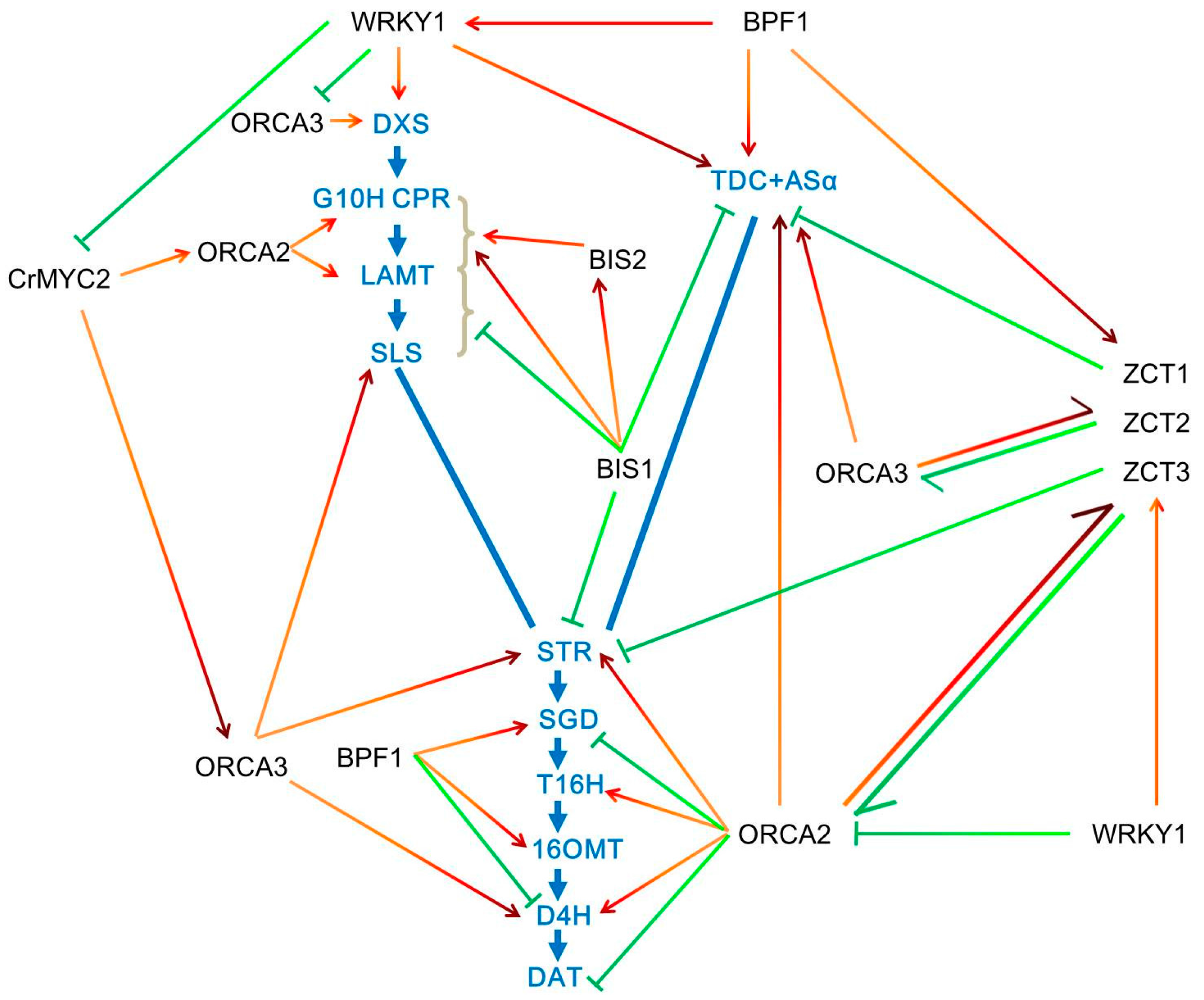 Regulation of TIA biosynthetic pathways by transcription factors in Catharanthus roseus. Various structural genes (marked in blue) in TIA biosynthetic pathway are regulated by different transcription factors (TFs). ORCAs are believed to be key regulators that directly bind to the promoters of structural genes involved in TIA biosynthesis. Several TFs such as WRKYs not only control the expression of structural genes but also regulate the expression of other TFs including MYC2, ORCAs, ZCTs, etc. Some TFs such as MYC2 could not directly regulate the expression of structural genes in biosynthetic pathways. Therefore, these TFs form a transcriptional regulatory network for TIA biosynthetic pathways. Among them, some TFs, such as BIS2, ZCT2 and WRKY2 (marked in green), are negative regulators, whereas most TFs (marked in red) are positively regulate TIA biosynthesis. DXS, 1-deoxy-d-xylulose 5-phosphate synthase; G10H, geraniol 10-hydroxylase; CPR, cytochrome P450 reductase; LAMT, loganic acid methyltransferase; SLS, secologanin synthase; STR, strictosidine synthase; SGD, strictosidine β-d-glucosidase; CR, cathenamine reductases; T16H2, tabersonine 16-hydroxylase 2; 16OMT, 16-hydroxytabersonine-16-O-methyltransferase; T3O, tabersonine 3-oxygenase; T3R, tabersonine 3-reductase; NMT, N-methyltransferase; D4H, desacetoxyvindoline 4-hydroxylase; DAT, acetyl CoA: deacetylvindoline 4-O-acetyltransferase.
