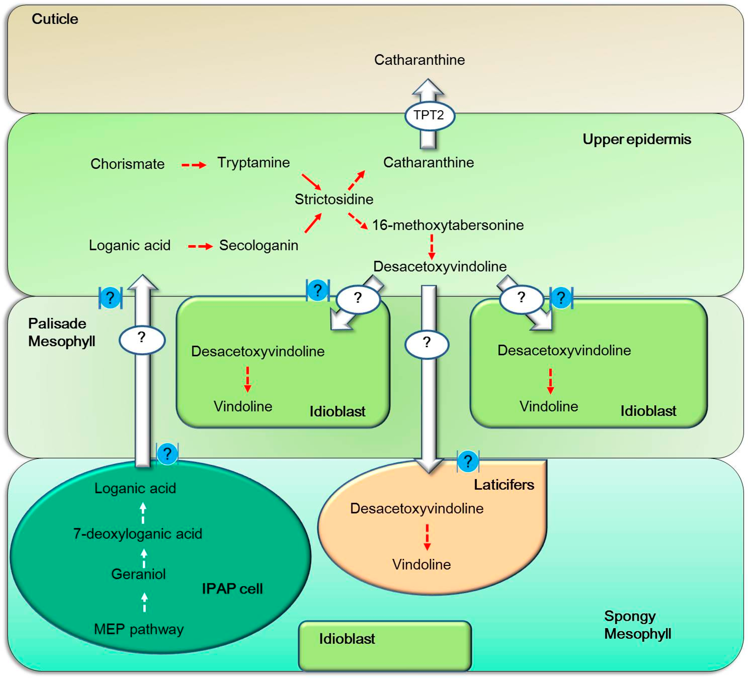 Tissue-specific biosynthesis and inter-cellular transport of TIAs through known and unknown transporters in Catharanthus roseus. The main TIA-biosynthesizing cells in the leaf of C. roseus include palisade and spongy mesophyll cells, internal phloem-associated parenchyma (IPAP), epidermal cells, laticifers and idioblasts. So far, most transporters possibly involved in transport of TIA intermediates or end products between these cells are unknown. The symbol “?” indicates the unknown transportation system of inter-cellular transport. The only identified transporter responsible for releasing of catharanthine out of upper epidermal cells onto cuticle is an ABC transporter TPT2. Whether plasmodesmata, symbolized in blue balls, are also involved in TIA intermediate transport between different types of cells remain to be determined.