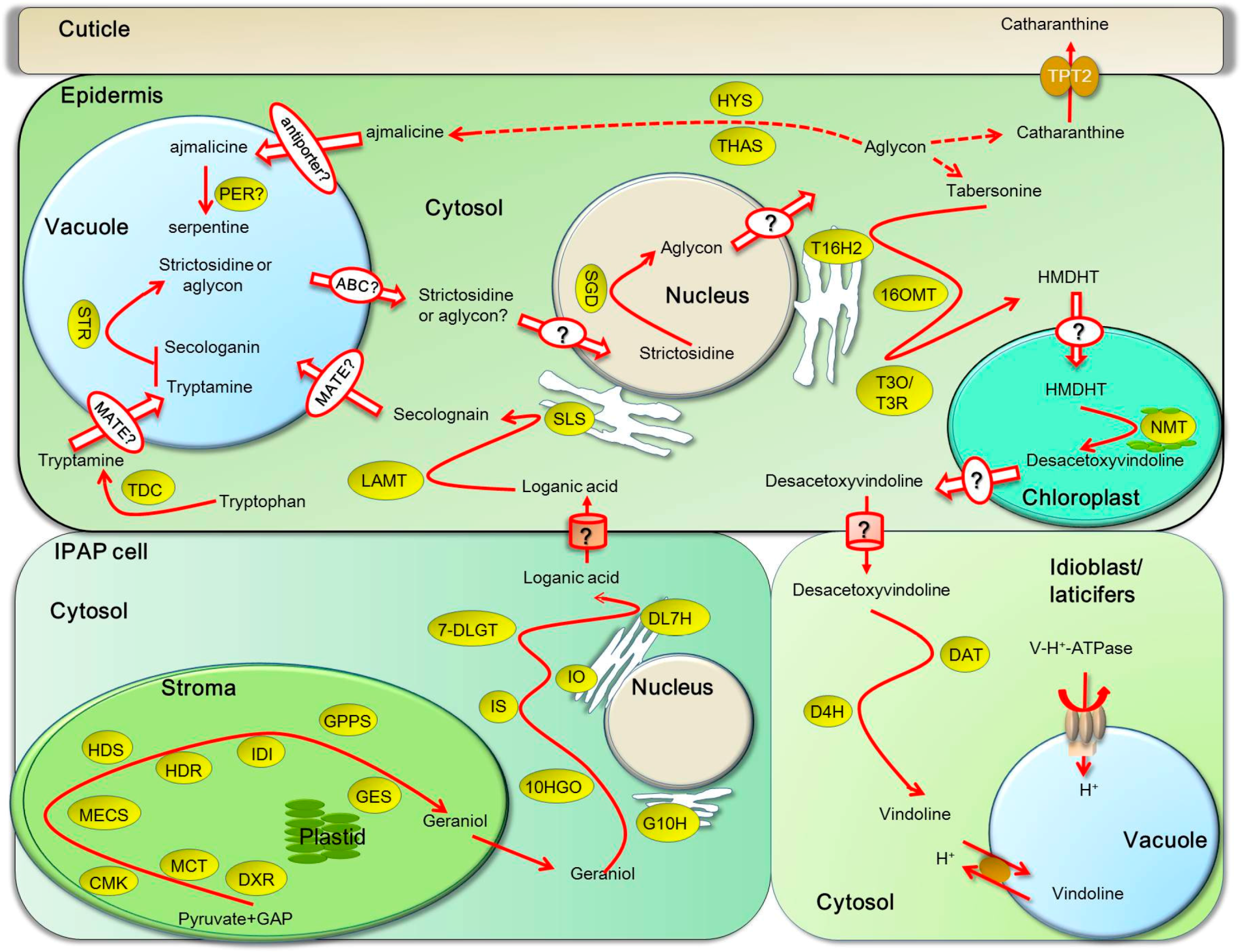 Subcellular compartmentation of TIA biosynthesis and inter- or intra-cellular transport of TIAs in Catharanthus roseus. TIA biosynthetic pathway in aerial organs of C. roseus occurs in four cell types: internal phloem-associated parenchyma (IPAP), epidermal cells, laticifers and idioblasts. An ATP-binding cassette transporters TPT2 can transport catharanthine from epidermal cells to deposit on cuticle. The transporters transport TIA intermediates between these cells, such as desacetoxyvindoline from epidermal cells to laticifers and idioblasts for vindoline biosynthesis and loganic acid communicates between the epidermal cells and IPAP cells, remain unknown, as indicated by question marks. In each type of cells, primarily, the epidermal cells, the vacuole, the chloroplast and possibly, the nucleus, are involved in the TIA biosynthesis. However, transporters or transport mechanisms for cross-membrane communication of these intermediates are largely unknown. How do two important precursors secolognain and tryptamine are transported into the vacuole for their condensation into strictosidine by vacuole-localized STR? Are they transported by MATE transporters? What is it necessary for SGD localization in the nucleus, as reported, since aglycon is still need to be transported out of the nucleus? How the product of T3O/T3R is transported into the chloroplast for methylation by the granule-localized NMT? All these questions need to be answered to give a clear scenario of intermediate transport or trafficking during the TIA biosynthesis. Abbreviations are: SGD, strictosidine β-d-glucosidase; STR, strictosidine synthase; TDC, tryptophan decarboxylase; DXS, 1-deoxy-d-xylulose 5-phosphate synthase; DXR, 1-deoxy-d-xylulose 5-phosphate reductoisomerase; MCT, MEP cytidyltransferase; CMK, 4-(cytidine 5’-diphospho)-2-C-methyl-d-erythritol kinase; MECS, 2-C-methylerythritol 2,4-cyclodiphosphate synthase; HDS, hydroxymethylbutenyl 4-diphosphate synthase; HDR, hydroxymethylbutenyl 4-diphosphate reductase; IDI, IPP isomerase; GPPS, geranyldiphosphate synthase; GES, geraniol synthase; G10H, geraniol 10-hydroxylase; 10HGO, 10-hydroxygeraniol dehydrogenase; IDS, iridoid synthase; 7DLS, 7-deoxyloganetic acid synthase; DLGT, 7-deoxyloganetic acid glucosyltransferase; DL7H, 7-deoxyloganic acid 7-hydroxylase; LAMT, loganic acid methyltransferase; SLS, secologanin synthase; T16H2, tabersonine 16-hydroxylase 2; 16OMT, 16-hydroxytabersonine-16-O-methyltransferase; T3O, tabersonine 3-oxygenase; T3R, tabersonine 3-reductase; NMT, N-methyltransferase; D4H, desacetoxyvindoline 4-hydroxylase; DAT, acetyl CoA: deacetylvindoline 4-O-acetyltransferase.