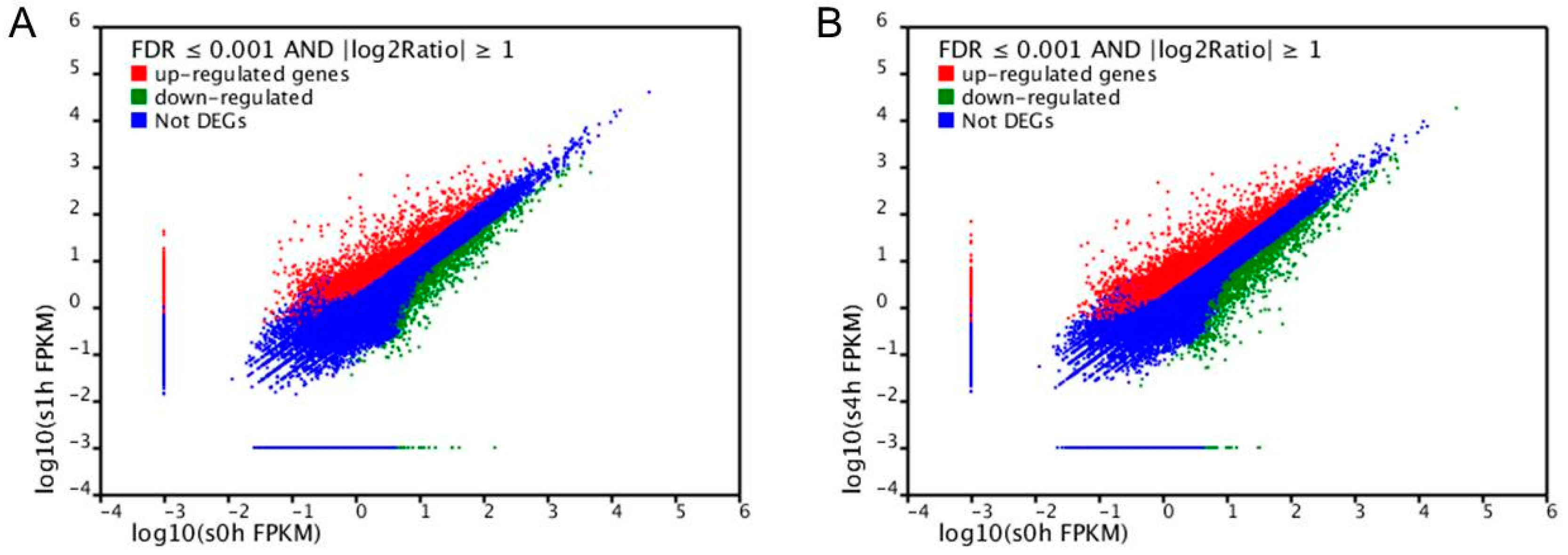 MeJA is identified as an important signaling molecule in TIA biosynthetic pathway in many plants [95]. In order to excavate and identify transcription factors that are involved in TIA biosynthesis, we collected leaves from one month old solid plant at different time points after MeJA treatment for transcriptome analysis. According to the results of RNA-seq (Figure 5), large number of genes in C. roseus show differential expression after MeJA treatment, with more up-regulated genes than down-regulated expression genes. It can be inferred that there are more genes playing positive roles in MeJA-induced signal pathway than that playing negative roles.