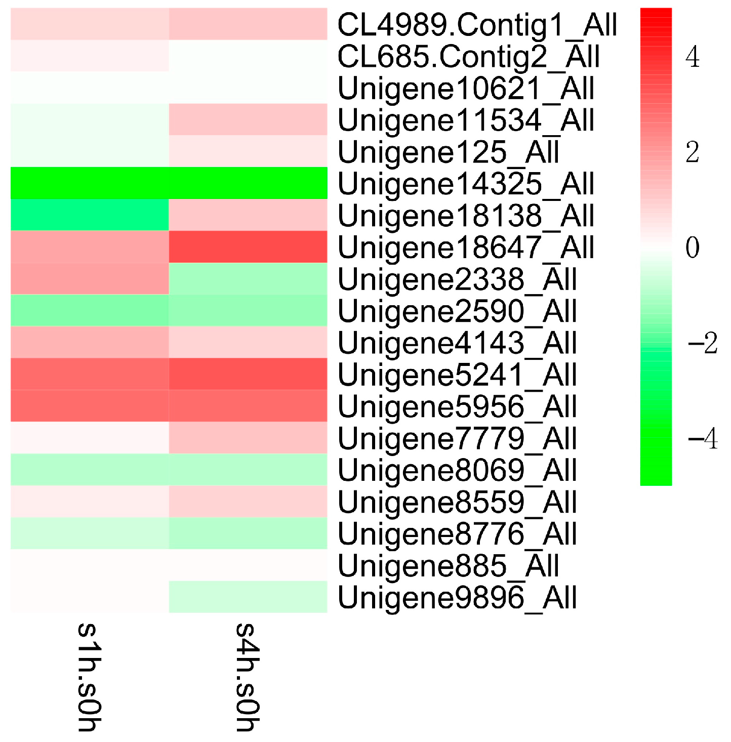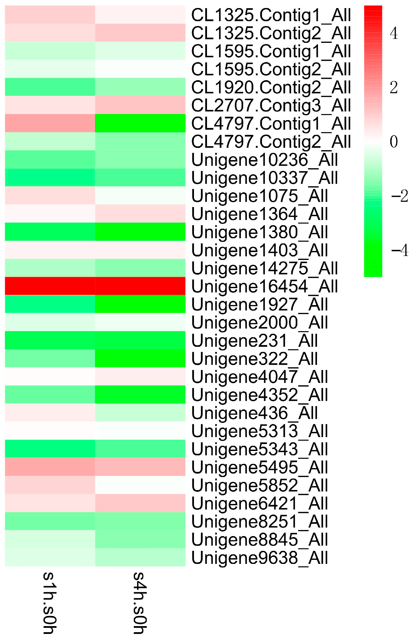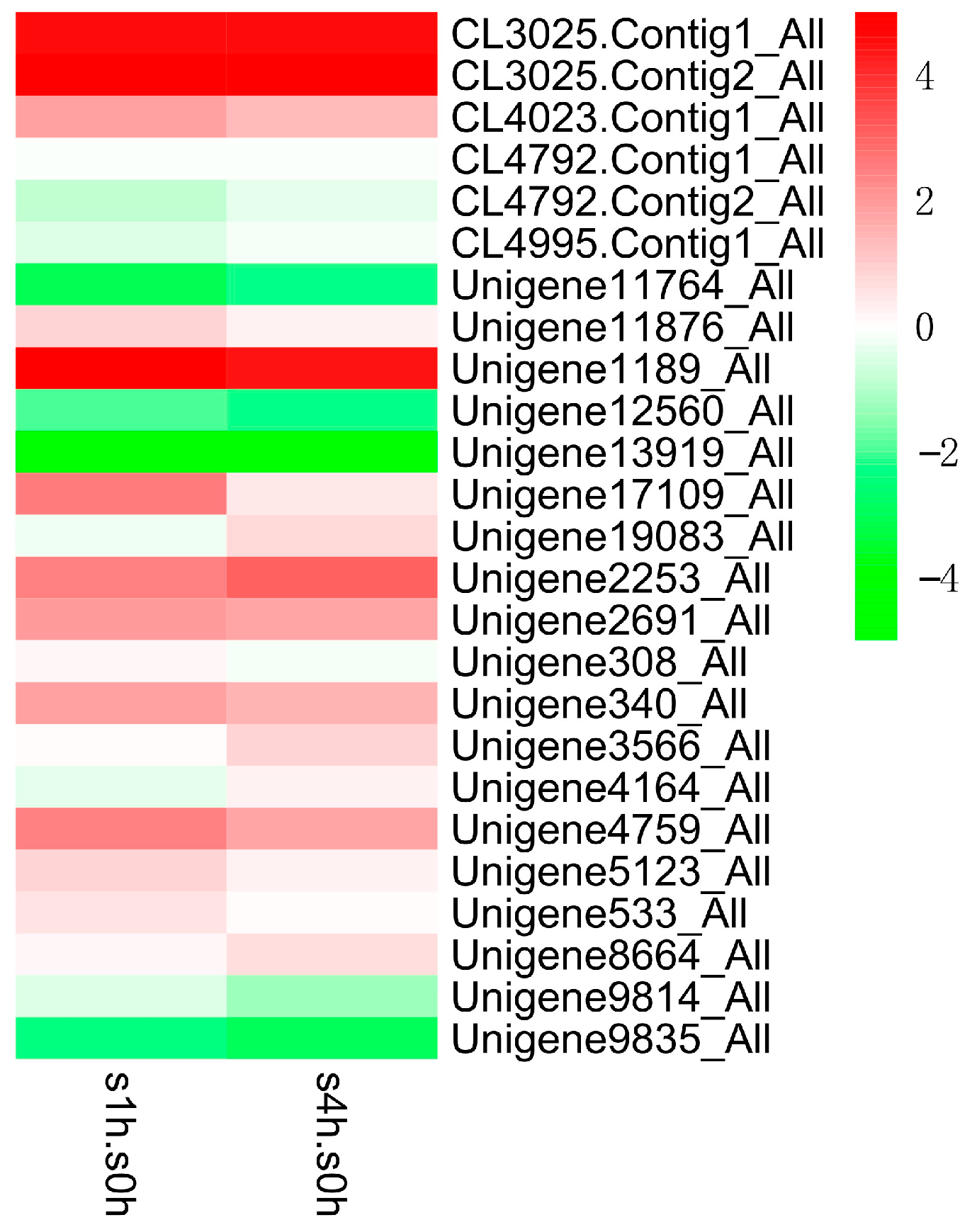 Expression patterns (log2 of FPKM) of WRKY family in C. roseus after one-hour (s1h.s0h) and four-hour (s4h.s0h) treatments with MeJA.