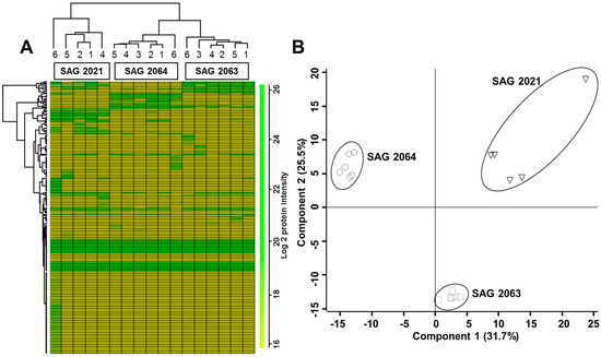 (A) Heat map shows the unsupervised hierarchical clustering of proteins from SAG 2021, SAG 2063 and SAG 2064 and all six replicates are clustered together. The log10 value of the MS signal intensity is shown; (B) Principal component analysis of logarithmized values without z-scoring indicating the strains used for the analysis.