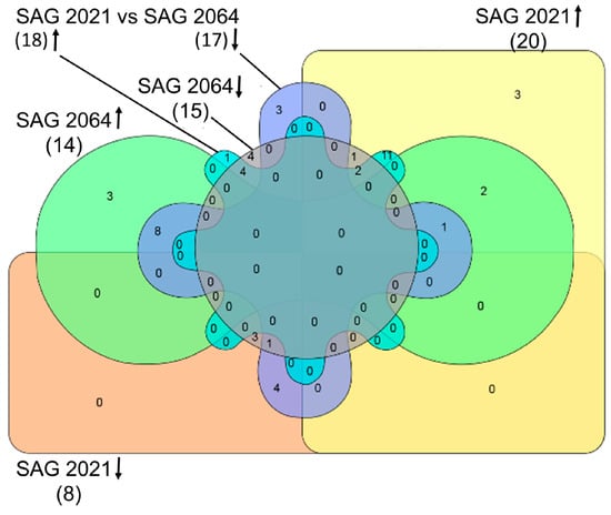 Venn diagram created using InteractiVenn, a web-based tool to compare the accession numbers of proteins identified. Total number of proteins is listed within the parenthesis, up- and down-arrows indicate up- and down-regulated proteins, respectively. Colour codes: yellow-SAG 2021 up-regulated, orange-SAG 2021 down-regulated, green-SAG 2064 up-regulated, purple-SAG 2064 down-regulated, blue-SAG 2021 up-regulated and grey SAG 2064 down-regulated.