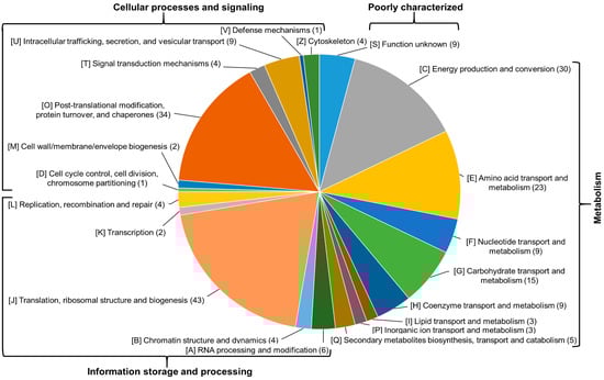 The eggNOG classification revealed that the identified proteins belong to four functional groups: cellular processes and signaling (D, M, O, T, U, V and Z), information storage and processing (A, B, J, K and L), metabolism (C, E, F, G, H, I, P and Q), and poorly characterized (R) (Figure 3). An assignment to a Cluster of Orthologous Group (COG) was not possible for four proteins (E1ZQB3, E1Z2U9, E1Z360 and A0A087SQC7) for which the query sequence was too large, and three proteins (E1Z2F4, A0A087SPK7 and A0A087SHV8) returned with no possible COG.