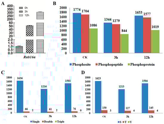 (A) qRT-PCR (quantitative Real Time-Polymerase Chain Reaction) analysis of abscisic acid (ABA) responsive gene Rab16a in CK, 3 and 12 h samples; (B) The number of identified phosphosites, phosphopeptides and phosphoproteins; (C) The counts of phosphopeptides carrying single, double and triple phosphorylation modifications; (D) The counts of phosphosites in serine, threonine and tyrosine.