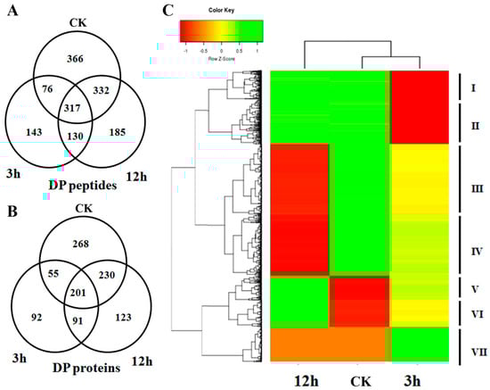 (A) Venn diagram showing the number of differentially phosphorylated (DP) phosphopeptides identified in control (CK), 3 and 12 h; (B) Venn diagram showing the number of DP phosphoproteins identified in CK, 3 and 12 h; (C) Hierarchical clustering analysis of the DP proteins among CK, 3 and 12 h. Color bar on the left represents the log2 phosphorylation intensity values. Red, yellow and green indicate the low, medium and high phosphorylation intensity values respectively.
