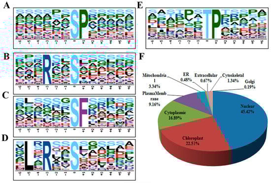Substrate specificity of kinases is largely determined by the motifs harboring the phosphosite. Therefore, a view of the conserved motifs around phosphosites of the DP proteins may provide useful clues to find the kinases catalyzing phosphorylation on them. With the aid of a written program, we extracted a 13 amino acid-long sequence with the phosphosite in the center for all the 1636 unique phosphosites on DP proteins, including 1484 phosphoserines, 148 phosphothreonines and 4 phosphotyrosines. Subsequently, 1589 AA sequences were extracted and inputted into an online tool Motif-X (http://motif-x.med.harvard.edu/) [36] for conserved motif detection and resulted in the identification of 4 phosphoserine motifs (sequences number n > 100) and 1 phosphothreonine motif (n > 100) (Figure 3A–E). As found in many other cases, proline-directed motifs (sP) and (tP) are most commonly present around the phosphosites of our DP proteins [37,38,39,40]. Proteins with a (sP) motif have been reported to be substrates of MAPKs, SnRK2s (sucrose non-fermenting1-related protein kinase 2), RLKs (receptor-like kinases) and many other kinases [41]. We also identified two basophilic motifs (Rxxs) and (LxRxxs) which could be recognized by MAPKK, CaMK (calmodulin-dependent protein kinase)-II and protein kinase A [41]. Interestingly, (sF) has been rarely reported by previous reports in many species including rice [37,38,41]; this study together with two of our previous cases we found it as an over-represented motif in rice leaf, seed and seedlings [39,40]. This observation might be ascribed to the difference in methods of protein extraction and MS identification.