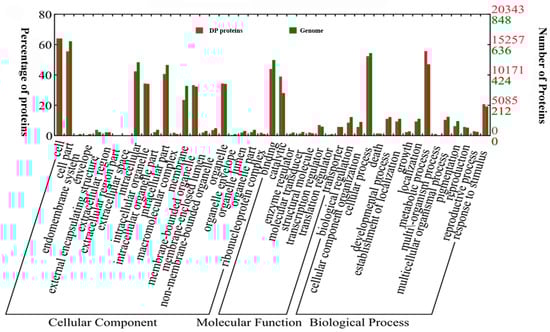 GO (Gene Ontology) analysis of DP proteins in terms of cellular components, molecular functions and biological processes.