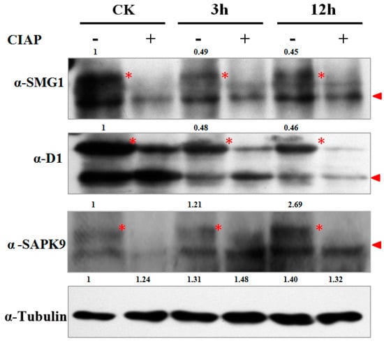 To dephosphorylate the proteins, each 20 µg protein sample was treated by 1 µL of calf intestinal alkaline phosphatase (Takara, Dalian, China) at 37 °C for 2 h. Western-blot analysis was performed as described by Qiu et al. [40] 2016. Briefly, 20 µg denatured total protein was resolved in 10% SDS (sodium dodecyl sulfate)-polyacrylamide gels. Then, the separated proteins bands were transferred onto a 0.45 µm polyvinylidene fluoride fluoropolymer (PVDF) membrane (Millpore, Darmstadt, Germany) by using an electrophoretic blotting system (Bio-Rad, Hercules, CA, USA). The target protein bands were sequentially detected with corresponding primary antibodies (1:1000 dilution), secondary antibody IgG conjugated with a HRP (Horseradish Peroxidase) (1:10,000 dilution), and visualized by using the enhanced chemiluminescence (Pierce, Waltham, WA, USA). Anti-D1, anti-SAPK9 and anti-SMG1 were synthesized by Genescript Company (Shanghai, China), while anti-β-tubulin (Cat No. M20005, Abmart, Berkeley, CA, USA), anti-GST (Cat: CW0085, CWBIO, Beijing, China) and anti-His (Cat: CW0083, CWBIO, Beijing, China) were commercially purchased. Quantification of the band intensities on the immune-blots was performed using the ImageJ software (v2.1.4.7) according to the instructions (http://rsb.info.nih.gov/ij/docs/menus/analyze.html#gels). All the sample intensities were first normalized to the control tubulin, and then calculated based on the ratio to set the relative level of CK into 1.