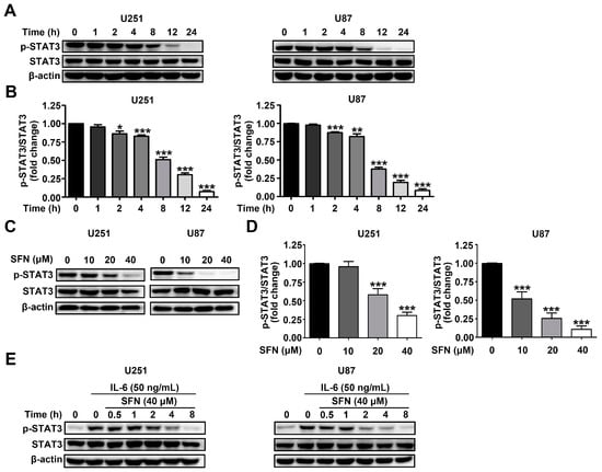 SFN effectively suppresses the activation of STAT3 in GBM cells. (A,B) Cells were treated with SFN (40 µM) and cultured for indicated time points; (C,D) cellswere treated with indicated concentrations of SFN and then harvested 24 h later; (E,F) cells were pretreated with 40 µM SFN for various time periods (0–8 h) before stimulation by IL-6 (50 ng/mL) for 15 min; and (G,H) cells were pretreated with SFN at indicated concentrations for 8 h before stimulation by IL-6 (50 ng/mL) for 15 min. Whole-cell lysates were processed for Western blot analysis using anti-phospho-STAT3 and anti-STAT3 antibodies. The bands corresponding to each protein were quantified and normalized relative to band intensities for control group. Data are represented as means ± SD. * p < 0.05, ** p < 0.01, and *** p < 0.001 versus the control group or the IL-6 only treatment group.