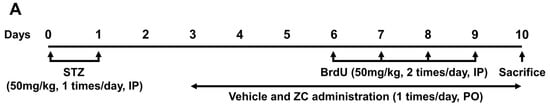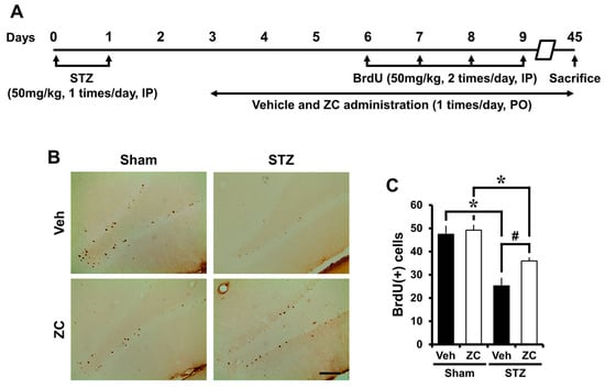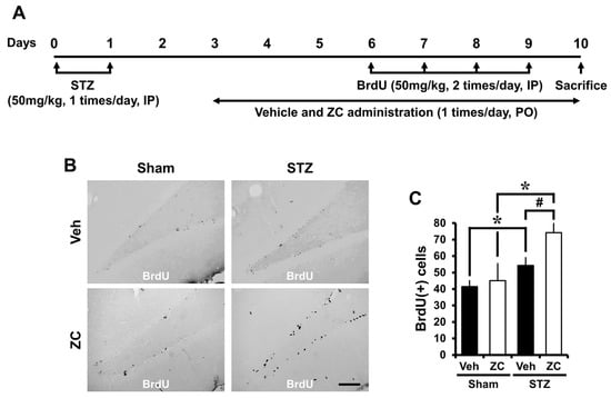 ZC increases survival of BrdU-positive cells in the late phase of STZ-induced diabetic rats. (A) Experimental procedure in the late phase of STZ-induced diabetic rats; (B) Bright field photomicrographs show surviving newborn cells. In the late phase, the STZ-injected group showed a significant decrease of BrdU (+) cells. However, ZC treatment by gavage for six weeks after STZ-induced hyperglycemia significantly increased BrdU (+) cells. Scale bar = 100 µm; (C) Bar graph represents BrdU-positive cells in the SGZ/GCL. Data are means ± SE, n = 6–8 from each group. * p < 0.05, versus sham group; # p < 0.05, versus vehicle-treated STZ group.