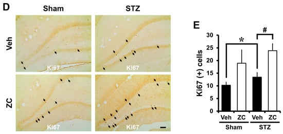 ZC increases proliferation of progenitor cells in the early phase of STZ-induced diabetic rats. (A) Experimental procedure in the early phase of STZ-induced diabetic rats. IP: intraperitoneal, PO: per os; (B) Bright field photomicrographs show BrdU (+) progenitor cells in the hippocampal dentate gyrus (DG). In the early phase, STZ-injected group showed a significant increase of BrdU (+) cells. ZC treatment by gavage for one week after STZ-induced hyperglycemia further increased BrdU (+) cells. Scale bar = 100 µm; (C) Bar graph represents the number of BrdU-positive cells in the subgranular zone (SGZ) of DG. Data are means ± SE, n = 7–12 from each group. * p < 0.05, versus vehicle-treated sham group; # p < 0.05, versus vehicle-treated STZ group; (D) Representative photomicrographs show Ki67 (+) cells in the hippocampal DG. The Ki67 (+) cells is indicated by a black arrow. In the early phase, the STZ-injected group showed a significant increase of Ki67 (+) cells. Short-term ZC treatment increased the number of Ki67 positive cells in STZ-induced diabetic rats. Scale bar = 100 µm; (E) Bar graph represents the number of Ki67 (+) cells in the SGZ of DG. Data are means ± SE, n = 7–12 from each group. * p < 0.05, versus vehicle-treated sham group; # p < 0.05, versus vehicle-treated STZ group.