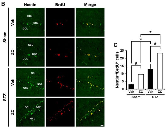 ZC increases neural progenitor cells (NPCs) proliferation in the early phase of STZ-induced diabetic rats. (A) Experimental procedure in the early phase of STZ-induced diabetic rats; (B) Fluorescent images show Nestin+/BrdU+ cells. In the early phase, the STZ-injected group showed a significant increase of Nestin+/BrdU+ cells. Short-term ZC treatment increased the number of Nestin+/BrdU+ cells in both the sham-operated and the STZ-injected group. Scale bar = 20 µm; (C) Bar graph represents the number of Nestin+/BrdU+ cells in the SGZ of DG. Data are means ± SE, n = 5–6 from each group. * p < 0.05, versus sham group; # p < 0.05, versus vehicle-treated group. GCL: granular cell layer; SGZ: subgranular zone.
