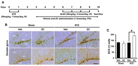 ZC increases DCX-positive cells in the early phase of STZ-induced diabetic rats. (A) Experimental procedure in the early phase of STZ-induced diabetic rats; (B) Photomicrographs show DCX (+) neuroblasts in the hippocampal DG. The STZ-injected group showed a similar level of DCX expression compared to the sham-operated group. However, ZC treatment by gavage for one week after STZ-induced hyperglycemia significantly increased DCX (+) cells. Scale bar = 100 µm; (C) Bar graph represents the number of DCX-positive cells in the SGZ/GCL. Data are means ± SE, n = 7–12 from each group. # p < 0.05, versus vehicle-treated STZ group. ML: molecular layer; GCL: granular cell layer; SGZ: subgranular zone; H: hilus.