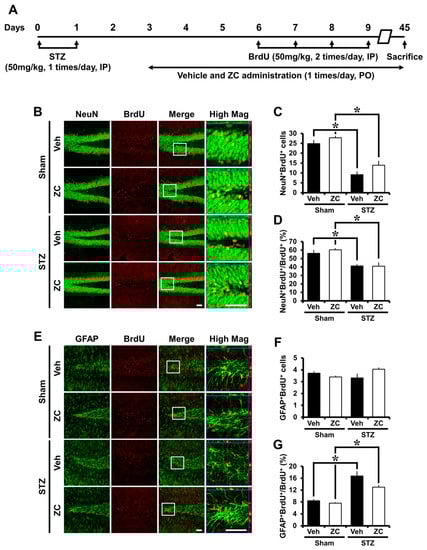 We then investigated the phenotype of cells that have survived in the late phase of STZ-induced diabetes. The phenotypes of newly proliferated cells in the DG include neuron (BrdU+/NeuN+) and glia (BrdU+/GFAP+). Numerous BrdU positive cells were also positive for NeuN. The proportion and number of BrdU positive cells expressing NeuN was significantly decreased in the STZ-injected group compared to the sham-operated group. However, no significant differences in the proportion and number of BrdU positive cells expressing NeuN were found between vehicle- and ZC-treated rats under sham-operation or STZ injection. In addition, a significant difference was not observed in the number of BrdU positive cells expressing GFAP between the groups. However, the proportion of BrdU positive cells expressing GFAP was significantly increased in the STZ-injected group compared to the sham-operated group (Figure 5). These results suggest that ZC treatment has no effect on neurogenesis during the late phase of STZ-induced diabetes.