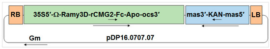 Schematic representation of binary plasmid (pDP16.0707.07) coding for the rCMG2-Fc-Apo protein. RB: right border; LB: left border; 35S: Cauliflower Mosaic Virus (CaMV) promoter; Ramy3D: coding sequence for the rice α-amylase 3D gene signal peptide; Ω:Ω sequence; rCMG2-Fc-Apo: gene coding for the anthrax decoy fusion protein with intact glycosylation site on Fc region; ocs: octopine synthase terminator; mas5′ and mas3′: transcription initiation and termination sequences, respectively, from the mannopine synthase gene of Agrobacterium tumefaciens; KAN: gene coding for resistance to the antibiotic kanamycin, the arrows indicate transcription direction from 5′ to 3′ ends.