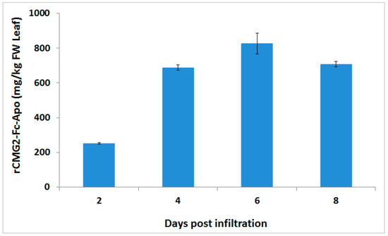 Transient production of the rCMG2-Fc-Apo protein in Nicotiana benthamiana was measured by ELISA using Protein-A as a capture molecule and anti-human IgG as a detection antibody (Figure 2). To determine the production kinetics, the expression level of rCMG2-Fc-Apo was estimated at different post-infiltration time points. The production kinetics were determined over eight days post-infiltration on a two-day interval. The results showed that the mass of rCMG2-Fc-Apo per leaf fresh weight peaked at day six post-infiltration at about 800 mg/kg fresh weight (FW), after which time the production started to decline. These results suggested that day six was the optimal time for transient production of rCMG2-Fc-Apo protein in Nicotiana benthamiana plants.