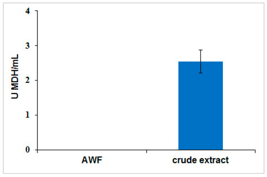 Contamination of intracellular proteins in the apoplast fluid was estimated by measuring an intracellular enzyme marker, malate dehydrogenase (MDH). This enzyme is part of Kreb’s cycle, catalyzing the reversible oxidation of malate to oxaloacetate. Since the reaction resides within the matrix of the mitochondrion, it is an efficient intracellular marker. The apoplast wash fluid from post-agroinfiltrated Nicotiana benthamiana leaves was recovered for the MDH enzyme assay. The results showed that no measurable MDH activity was observed in the apoplast wash fluid when compared with the whole leaf extract (Figure 3). This result confirmed that the recovered protein from apoplast fluid is free from intracellular contaminants.