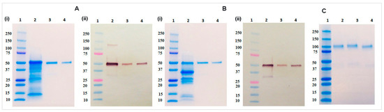 SDS-PAGE, immunoblot, and non-reducing gel analysis. (A) Whole leaf extracts and (B) apoplast wash fluid. (i): SDS-PAGE of whole leaf extract. Lane 1 Precision Plus ProteinTM Dual Color Standards (Bio-Rad); Lane 2 crude leaf extract (20 µg); Lane 3 purified rCMG2-Fc-Apo (500 ng); Lane 4 CMG2-Fc standard (500 ng); (ii): Immunoblot analysis of whole leaf extract. Lane 1 Precision Plus ProteinTM Dual Color Standards (Bio-Rad); Lane 2 crude leaf extract (10 µg); Lane 3 purified rCMG2-Fc-Apo (100 ng); Lane 4 CMG2-Fc standard (100 ng); (C) Non-reducing gel. Lane 1 Precision Plus ProteinTM Dual Color Standards (Bio-Rad); Lane 2 purified rCMG2-Fc-Apo from whole leaf extract (500 ng); Lane 3 purified rCMG2-Fc-Apo from apoplast wash fluid (500 ng); Lane 4 CMG2-Fc standard (500 ng).