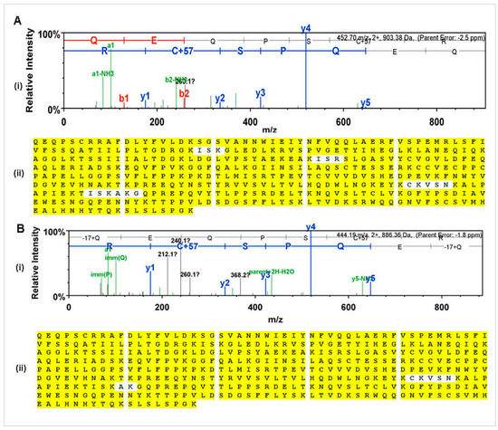 Mass spectrometry analysis: (A) rCMG2-Fc-Apo purified from whole leaf extract (B) rCMG2-Fc-Apo purified from apoplast wash fluid. (i): Unique peptide QEQPSCR was identified from the N-terminal region of mature protein purified from whole leaf extract and apoplast wash fluid. The b ions shown on the spectrum extend from the N-terminus and y ions shown on the spectrum extend from the C-terminus of the tryptic peptides. The colors indicate the loss of ammonia or water from either b or y ions (green), doubly charged b ions (red) and doubly charged y ions (blue). (ii): Peptide coverage of rCMG2-Fc-Apo protein. The white color background indicates the uncovered region and yellow color background indicates the peptide coverage.