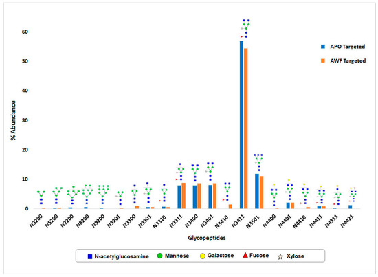 N-glycan distribution analysis of rCMG2-Fc-Apo purified from whole leaf extract (APO) and apoplast wash fluid (AWF). Different glycan structures observed at the N-linked glycosylation site on the Fc region. The abundance of each glycan structure is represented in a bar chart. The annotation on the x-axis represents N-glycan-number of Mannose and Galactose residues/number of GlucNAc residues/number of Fucose residues/number of Xylose residues.