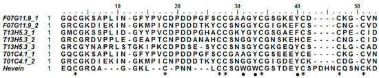 Hevein was discovered in the rubber tree (Hevea brasiliensis), where it is involved in the coagulation of latex. Hevein-like peptides bind to chitin, a polymer of N-acetylglucosamine, in a calcium-dependent manner [49]. These 29–43 amino acid chitin-binding domains are rich in cysteine, glycine, and several aromatic amino acids. Based upon the number of cysteine residues, they can be classified into three groups: 6C-, 8C-, and 10C hevein-like peptides [50]. To our knowledge, no such domains have been reported outside of the kingdoms of plants and fungi [6]. Three sequences, originating from C. elegans, appear to contain a domain similar to a hevein domain. Two of them (T01C4.1 and F07G11.9) contain two hevein-like domains, while T13H5.3 has three (Figure 1). To exclude any possible contamination, additional available genomes of other nematode species were queried for this domain (see Table S1). Several species seem to have genes containing one to three hevein-like domains. In particular, all free-living nematode species investigated in this study possess such genes. In addition, hevein-like domains were also detected in some insect and animal parasitic nematodes assigned to clade 8a, 9b, 10a, and 10b (classification according to [51]). No hevein-like domains were found in nematode species from clades 2a, 8b, and 9c. A total of 136 hevein-like domains were found in 32 species of the additional queried genomes. Only nine of these domains did not contain the eight conserved cysteine residues that are present in the original discovered hevein and hevein-like peptides. The eight cysteine residues form four disulfide bridges to stabilize the peptide [52]. Hevein-like peptides show three conserved aromatic amino acid residues, responsible for chitin binding (residues 21 (Trp), 23 (Trp), and 30 (Tyr)) and a conserved serine residue (S19) [53]. Two of the aromatic residues are conserved in all hevein-like domains of C. elegans, while at position 21 only T13H5.3_1 shows an aromatic amino acid (Figure 1). All three C. elegans proteins containing a hevein-like domain also have a glycoside hydrolase family 18 (GHF18) domain (PF00704) and a predicted N-terminal signal peptide in their sequence (Figure 1). In addition, the two longest proteins both have a stretch of LysM domains preceding the GHF18 domain. In accordance with these three C. elegans genes, the hevein containing genes in the additional investigated nematode genomes were also combined with a GHF18 domain and/or LysM domains. Furthermore, 16 sequences contained a domain with homology to the plant self-incompatibility protein S1 domain (PF05938). This domain was initially discovered in Papaver and has only been found in plants and some nematodes [54].