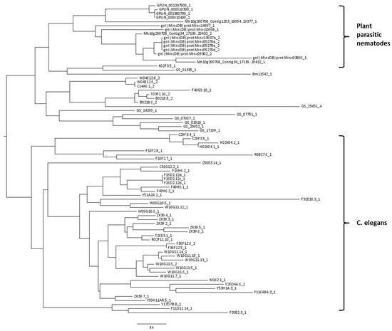 Midpoint rooted phylogenetic tree of 77 nematode C-type lectin-like domains (CTLDs) predicted with the maximum likelihood algorithm. Taxon labels give the full genome accession code of the gene containing the CTLD, followed by a number indicating which CTLD of that particular gene is used in this analysis. Explanation of prefixes: Bm: Brugia malayi, GPLIN: Globodera pallida, Mh10: Meloidogyne hapla, Mincdb: Meloidogyne incognita, GS: Ascaris suum. Taxon labels without any of the previous prefixes originate from Caenorhabditis elegans.