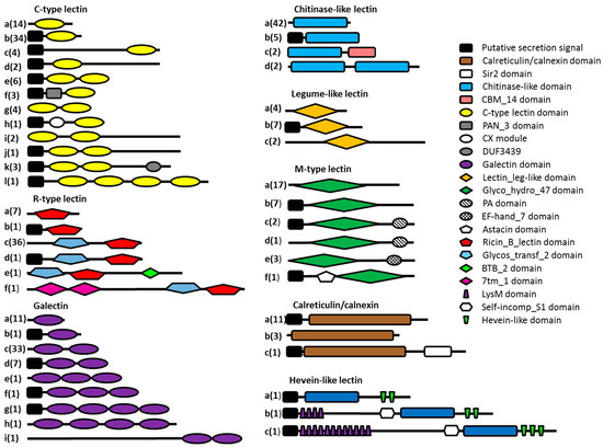 Schematic overview of the different types of potential lectins present in the seven investigated nematode genomes. Eight lectin classes are represented here, each divided into several subclasses (denoted by letters) according to the presence of other predicted protein domains. The number of sequences present in each subclass is indicated in brackets.