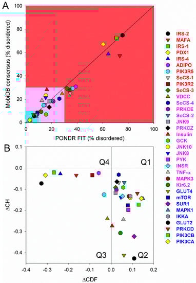 (A) Abundance of intrinsic disorder in human T2DM-related proteins. Consensus MobiDB vs. PONDR® FIT plot representing the correlation between the disorder content evaluated by PONDR® FIT (X-axis) and by consensus MobiDB (Y-axis). Solid black line corresponds to the diagonal. Following the accepted practice, two arbitrary cutoffs for the levels of intrinsic disorder are used to classify proteins as highly ordered (PIDRe < 10% light blue field), moderately disordered (10% ≤ PIDR < 30%, light pink field) and highly disordered (PIDR ≥ 30%, light red field) [28]. (B) Evaluating intrinsic disorder in human T2DM-related proteins by combined binary disorder classifiers, CH-plot [30], and CDF [30,31,32]. Here, the coordinates of each point were calculated as a distance of the corresponding protein in the CH-plot from the boundary (Y-coordinate) and an average distance of the respective CDF curve from the CDF boundary (X-coordinate). The four quadrants correspond to the following predictions: Q1, proteins predicted to be disordered by CH-plots, but ordered by CDFs; Q2, ordered proteins; Q3, proteins predicted to be disordered by CDFs, but compact by CH-plots (i.e., putative molten globules or hybrid proteins); Q4, proteins predicted to be disordered by both methods.