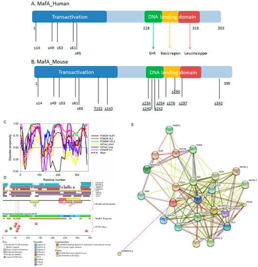 (A,B) show domain structure of two large MAFs, human and mouse MAFA proteins. In this diagram, the transactivation domain, the extended homology region, the basic region, and the leucine zipper domain are shown by blue, green, yellow, and red, respectively. Positions of known phosphorylation sites are shown. (C–E) represents the results of the multiparametric analysis of functional intrinsic disorder and interactability of human MAFA protein (UniProt ID: Q8NHW3). (C) Evaluating intrinsic disorder propensity by series of per-residue disorder predictors. Disorder profiles generated by PONDR® VLXT, PONDR® VSL2, PONDR® VL3, IUPred_short, IUPred_long, and PONDR® FIT, are shown by black, red, yellow, green, blue, and pink lines, respectively. Dark red dashed line shows the mean disorder propensity calculated by averaging disorder profiles of individual predictors. Light pink shadow around the PONDR® FIT shows error distribution. In these analyses, the predicted intrinsic disorder scores above 0.5 are considered to correspond to the disordered residues/regions, whereas regions with the disorder scores between 0.2 and 0.5 are considered flexible. (D) Analysis of the intrinsic disorder propensity and some important disorder-related functional information generated for human MAFA by the D2P2 database (available online: http://d2p2.pro/) [49]. Here, the green-and-white bar in the middle of the plot shows the predicted disorder agreement between nine predictors, with green parts corresponding to disordered regions by consensus. The yellow bar shows the location of the predicted disorder-based binding sites (molecular recognition features, MoRFs), whereas colored circles at the bottom of the plot show location of various PTMs. (E) Analysis of the interactivity of human MAFA by STRING computational platform that produces the network of predicted associations for a particular group of proteins [68].