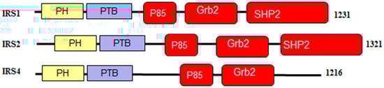 As shown in Figure 5, IRS1, IRS2, and IRS4 proteins consist of an amino terminal pleckstrin homologydomain (PH) and a phosphotyrosine-binding domain (PTB) and N-terminal tyrosine residues that act as phosphorylation sites to drive insulin/IGF-1 signaling [93]. The p85 and GRB2 domains contain phosphorylatable tyrosine residues which are used to bind SH2-containing effector proteins for the activation of the PI3K/AKT and MAPK/ERK signaling pathways [89,93,94]. Furthermore, the C-terminal regions of IRS1 and IRS2 have an additional binding site for interaction with the SH2 domain-containing protein, tyrosine phosphatase-2 (SHP2), providing a negative feedback loop by dephosphorylating the tyrosine residues responsible for binding [95,96,97,98,99,100].