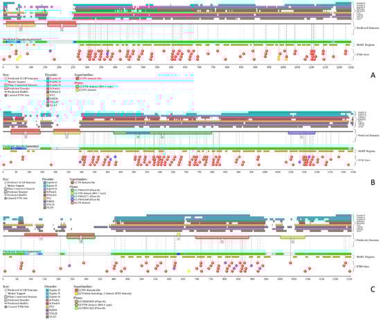 Analysis of the intrinsic disorder propensity and some important disorder-related functional information generated for human IRS1 (A), IRS2 (B), and IRS4 (C), by the D2P2 database (available online: http://d2p2.pro/). Keys are the same as in legend to Figure 4B.