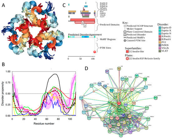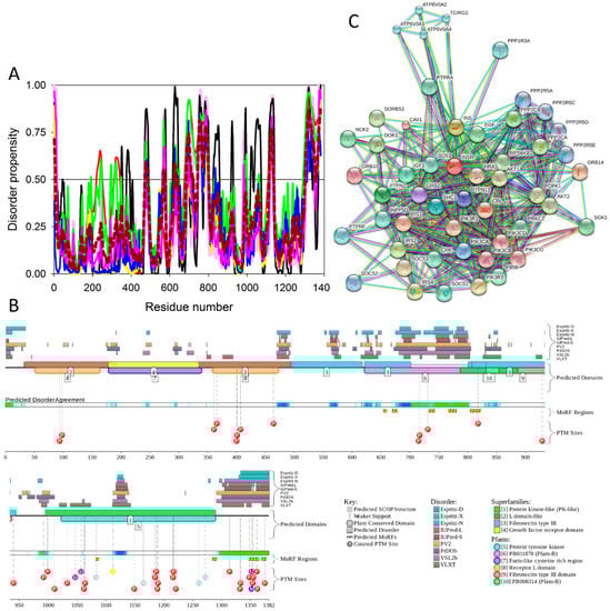 It was emphasized that the full-length monomeric form of the mature adiponectin is not found under native conditions due to the thermodynamic instability of this protein [127]. However, proteolytic cleavage products containing a globular C-terminal domain were found in vivo [127]. All these facts (multifunctionality, functional regulation via PTMs, instability of monomeric form) indicate that adiponectin might possess substantial levels of intrinsic disorder. In agreement with this hypothesis, Figure 12 shows that the N-terminal half of adiponectin is predicted to be highly disordered (see Figure 12B,C) and is expected to contain multiple PTM and protein–protein interaction sites (see Figure 12C). The high binding promiscuity of human adiponectin is evidenced by both the STING-generated PPI network (see Figure 12D) and by the results of the APID-based analysis showing nine interaction partners for this protein (see Table S1).