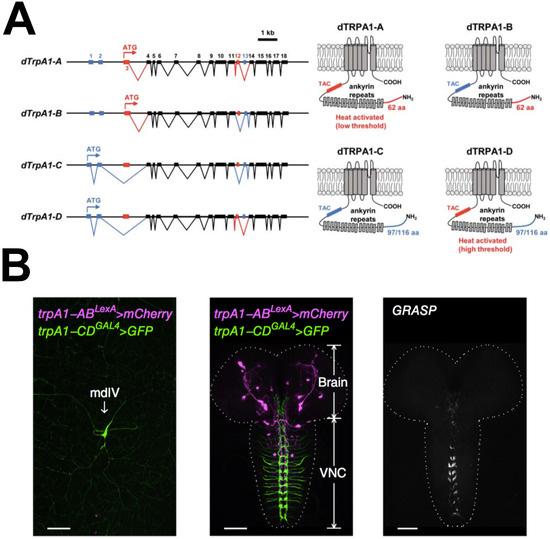 TRPA1 isoforms and their expression pattern in larvae. Taken from [11,15]. (A) gene and protein structures of the four TRPA1 isoforms [15]. trpA1 gene structures with exon numbering are shown on the left. The four isoforms originate from the use of an alternative translational start site (isoforms A/B use ATG in exon 3, red; isoforms C/D use ATG in exon 1, blue) and alternative splicing of exon 12 (included in isoforms A/D, red) and 13 (included in isoforms B/C, blue). TRPA1 protein structures are shown on the right. N-terminal region encoded by exon 3 is drawn in red (A/B), N-terminal region encoded by exon 1–2 is drawn in blue (C/D). TRP ankyrin cap (TAC) region between ankyrin repeats and first transmembrane domain encoded by exon 12 is drawn in red (A/D), the TAC region encoded by exon 13 is drawn in blue (B/C). Presumably, TAC is the element that confers temperature sensitivity to isoforms A/D, whilst the N-terminal region affects their activation threshold and responsiveness to the rate of temperature change [7,11]; (B) trpA1-CDGAL4- and trpA1-ABLexA-expressing neurons are distinct cell populations that possibly form synapses in the ventral nerve cord (VNC) and may function in a common neuronal circuit [11]. The trpA1-CDGAL4 reporter is expressed in multidendritic neurons (md neurons) in the larvae body wall, while trpA1-ABLexA is expressed in the larval brain and VNC. Green Fluorescent Protein reconstitution across synaptic partners (GRASP) signal indicates that the two cell populations are in close proximity in the VNC.