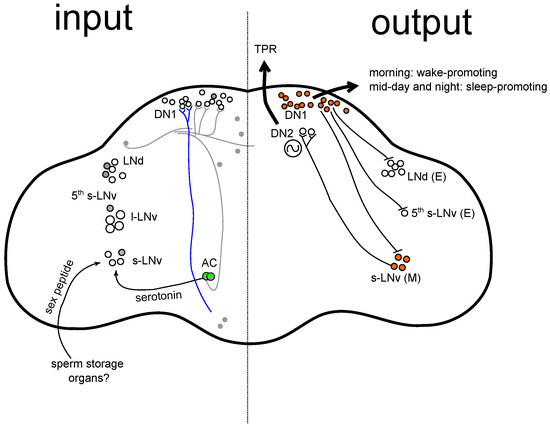 Interestingly, weakening of the siesta is more pronounced in mated females compared to virgins. The increase of day-time activity after mating has been described as part of the post-mating response in Drosophila melanogaster [65] and more recently also in Drosophila suzukii [66]. Like other post-mating behaviours, the effect of mating status on daytime activity depends on the transfer of sex peptide (SP) during mating [65]. Interestingly, it has been shown that s-LNv express the sex peptide receptor (SPR) [25] and the authors propose that s-LNv could integrate mating status and sleep pressure (Figure 2).