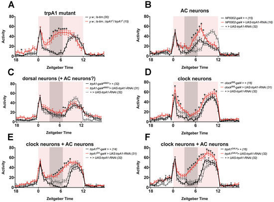 The results of these experiments are shown in Figure 3. Figure 3A shows activity profiles of wild-type and trpA1 mutant flies, confirming the increased activity during siesta when TRPA1 is lacking [30]. Subsequently, Figure 3B–F show the results of trpA1 knock-down in the different candidate neurons. We can reproduce the phenotype of trpA1 loss-of-function mutants by knock-down of trpA1 in a combination of AC neurons and clock neurons, as well as some other cells in the brain (using trpA1SH-gal4 or trpA1GAL4, Figure 3E,F). When discussing the data further, we focus on trpA1SH-gal4, since this line has a more limited expression than trpA1GAL4 [23,61,63]. These data show that trpA1 is required in trpA1SH-gal4-expressing cells to induce siesta, and that knock-down of trpA1 in these cells is sufficient to significantly reduce siesta. In contrast, we cannot reproduce the siesta phenotype by knock-down of trpA1 specifically in AC neurons (using NP0002-gal4, Figure 3B). Although the statistics show that experimental flies have increased activity during the late siesta compared to gal4 and UAS control flies, this is the result of an earlier E peak in both gal4 and experimental flies compared to UAS control flies. Finally, we could not reproduce the siesta phenotype by knock-down of trpA1 specifically in non-clock dorsal neurons and maybe AC neurons (using trpA148951-gal4, Figure 3C), or clock neurons (using clock856-gal4, Figure 3D). When trpA1 was knocked-down in all clock neurons, activity levels were increased during M peak and E peak, but not during the siesta.