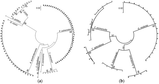 Neighbor-Joining trees (Saitou and Nei 1987 [36]) of (a) the codling moth Hymenoptera parasitoids (97 specimens, nine different genera) and (b) of their potential tortricid hosts (40 specimens, five different species). The evolutionary distances between coding sequences (651 positions) were computed using the Kimura two-parameter method (Kimura 1980 [37]). The confidence probabilities that the interior branch length is greater than zero (Dopazo 1994 [38]) were estimated using bootstrap tests (2000 replicates) and were represented next to the branches for a probability above 90%.